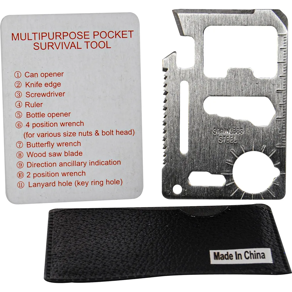 Survival business card multi tool that fits in your wallet with 11 functions.