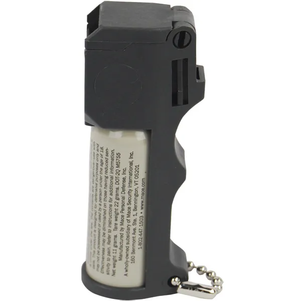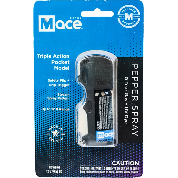 The Mace Pocket Model Triple Action Pepper Spray offers ultimate protection in an easy-to-carry pocket-sized canister. Its unique three-in-one formula combines OC pepper spray to cause eyes to slam shut and uncontrollable coughing and choking, tear gas to induce profuse tearing, an intense burning sensation to the face, and disorientation, plus a UV dye marks the assailant and may aid in identification once apprehended. Mace Triple Action Pocket features an easy finger-grip dispenser for a firm hold and correctly orients the unit even in the dark making it ideal choice for self defense and emergency use. Its compact design fits comfortably in a women's hand. With its convenient flip-top safety cap and key chain attachment, this compact pepper spray is perfectly suited for personal security on the go. It contains 12 grams with stream spray range up to 10 feet. Product Features: - Unique three-in-one formula - OC pepper spray causes eyes to slam shut & uncontrollable coughing & choking - Tear gas induces profuse tearing, intense burning sensation & disorientation - UV dye marks assailant & may aid in identification once apprehended - Convenient flip top safety cap & key chain attachment - Contains 12 grams / 0.42oz with spray stream range up to 10ft