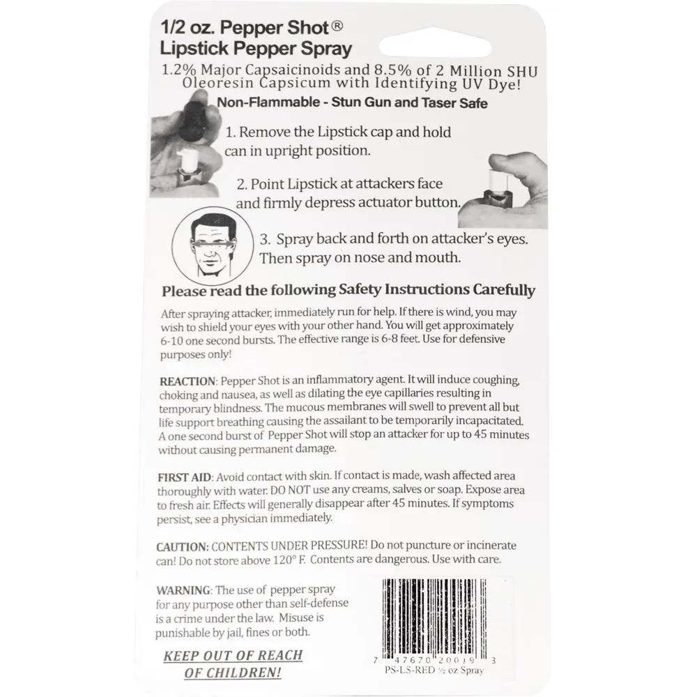 Pepper Shot 1.2% MC 1/2 oz lipstick pepper spray red. Its's designed for women. Pepper Shot Pepper Spray is made with 1.2% Major Capsaicinoids.