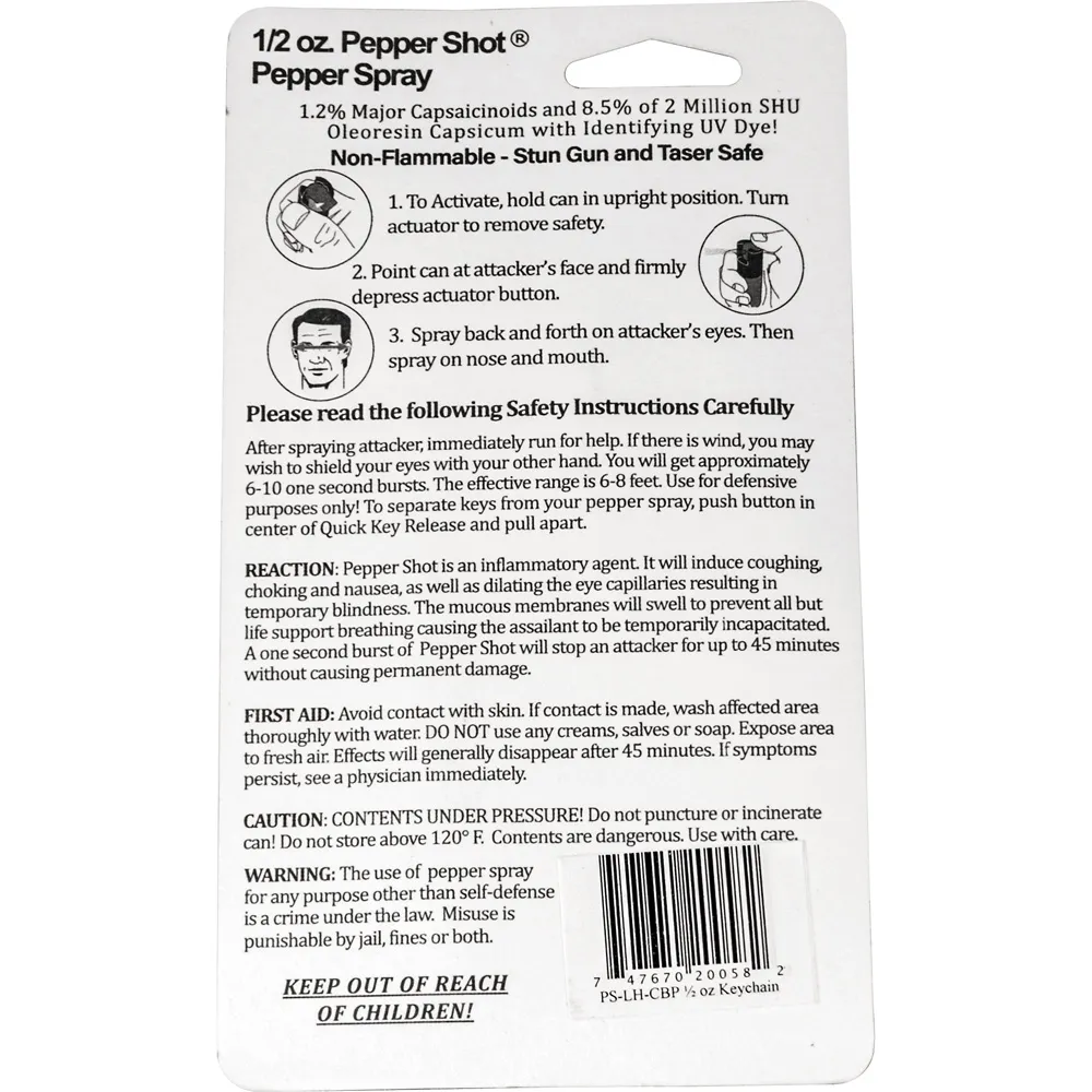 Pepper Shot 1/2 oz. Pepper Spray has a range of 6-8 feet and comes with a leatherette holster.
