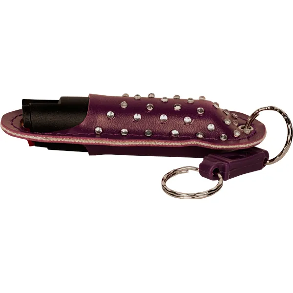 WildFire 1.4% MC 1/2 oz Halo Rhinestone Holster and quick release keychain purple. The WILDFIRE® PEPPER SPRAY is hot, hot, hot. The Major Capsaicinoids are the true heat measure, WildFire has the hottest on the market at 1.4% Major Capsaicinoids. In addition to causing an attacker pain, The WildFire 10% oleoresin capsicum formula swells the mucous membranes, which makes breathing difficult, and swells the veins in the eyes, causing the eyes to close. It's made from 2,000,000 SHU's of raw pepper and these effects can last up to 45 minutes and cause no permanent damage. Has a UV identifying dye to help aid in the identification of an attacker. Wildfire 1/2 oz. Pepper Spray has a range of 6-8 feet and comes with a leatherette halo rhinestone holster. Each unit provides 6-10 one-second bursts and comes with a quick key release keychain, and safety lock. 4 ¼" x 1 ⅝"