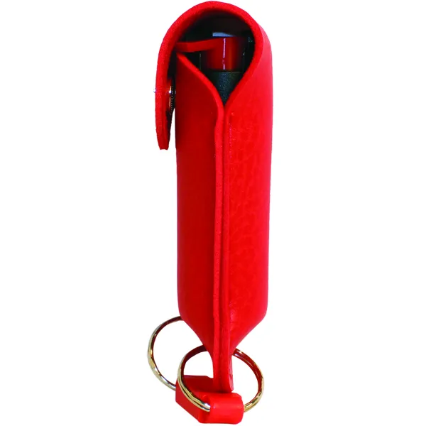 Wildfire 1/2 oz leatherette holster and Quick Release Key Chain red. The WILDFIRE® PEPPER SPRAY is hot, hot, hot. The Major Capsaicinoids are the true heat measure, WildFire has the hottest on the market at 1.4% Major Capsaicinoids. In addition to causing an attacker pain, The WildFire 10% oleoresin capsicum formula swells the mucous membranes, which makes breathing difficult, and swells the veins in the eyes, causing the eyes to close. It's made from 2,000,000 SHU's of raw pepper and these effects can last up to 45 minutes and cause no permanent damage. Has a UV identifying dye to help aid in the identification of an attacker. Wildfire 1/2 oz. Pepper Spray has a range of 6-8 feet and comes with a leatherette holster. Each unit provides 6-10 one-second bursts and comes with a quick key release keychain, and safety lock. 4 ¼" x 1 ½"