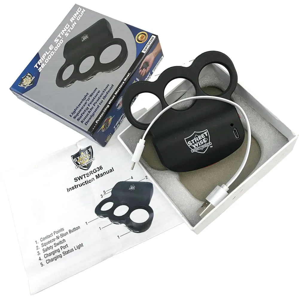CONTENTS: Streetwise Triple Sting Ring 28,000,000* Stun Gun Charging Cord Instructions *Actual Voltage output is difficult to measure and verify, but this unit compares to other brands that claim to be 28,000,000 or more volts.