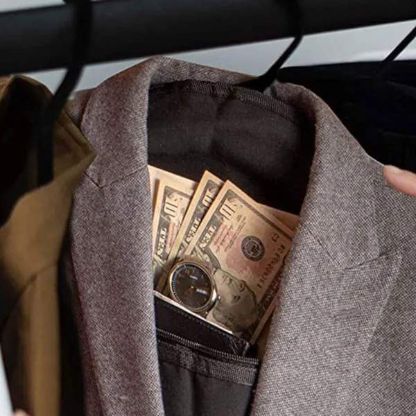 Introducing the Hanger Diversion Safe – the discreet and innovative storage solution that's perfect for keeping your most prized possessions safe and secure. With its clever design, this safe is perfectly placed in your closet, giving you a hidden space without compromising the seamless look of your wardrobe. Whether you’re storing cash, jewelry or important documents, the Hanger Diversion Safe lets you rest at ease knowing your most valuable items are protected. 17"W x 12.5"H Blends right in under any hanging garment but something with a high collar is recommended. Zippered closure and interior pocket allows for safe storage. Great hiding spot for cash, jewelry, precious metals, bitcoin wallet, passports, etc. Stealthy and sleek! Use it at home or on-the-go when travelling!