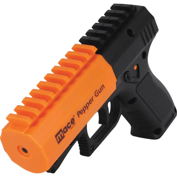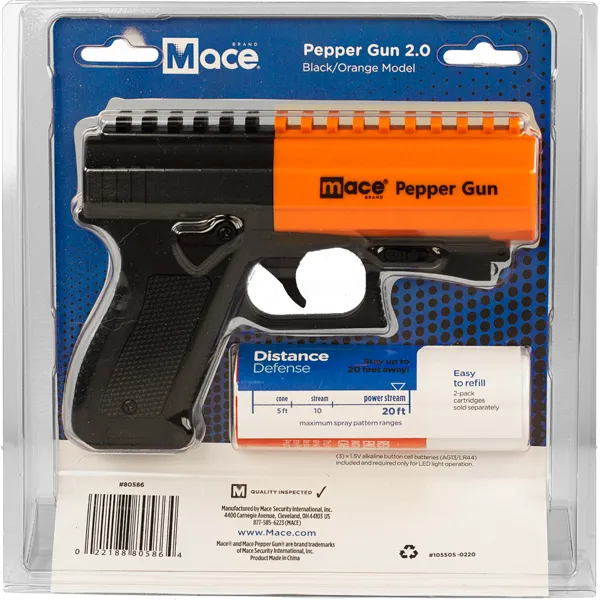 Featuring a convenient pistol-grip design, the Mace® Brand Pepper Gun® 2.0 allows for easy point-and-shoot accuracy. This pepper gun is designed to deliver powerful defenses of up to 7 bursts of 10% OC pepper at a distance of up to 20 feet, ensuring maximum security and accuracy. Refilling is hassle free with the easy-to-load cartridges that lock in place. The set includes both a 28-gram OC Pepper Cartridge and a Water Practice Cartridge. When sprayed with OC pepper spray, the target will be subject to difficulty in breathing, blurring vision, and an agonizing feeling on their skin. Additionally, the OC canister contains UV dye which leaves a visible trail for investigators to detect during their search. Prior to using your pepper gun in real situations, familiarize yourself with it and test your aim with the supplied Water Practice Cartridge. The spray pattern changes upon range: at 5 ft. it will be a cone spray effect, at 10 ft. it'll become a stream and then at 20 ft. you got a full power stream. Always ready when you need it but also taking precaution, the slide-release safety switch is designed to prevent accidental discharge. It is also designed with integrated Picatinny rail allows you to attach accessories to your Pepper Gun. With the DUAL MODE LED light, you can activate a powerful flashlight by pulling the trigger, and if you need to distract your target in a dark environment, just pull the trigger again to activate a blinking LED strobe. Features -Dual Mode LED -Safety switch to prevent accidental spraying -Picatinny rail for accessory attachments -Included (1x) OC Pepper Cartridge and (1x) Water Practice Cartridge (preloaded) -1.5V AG13/LR44 (3x) batteries included - only required for the LED feature