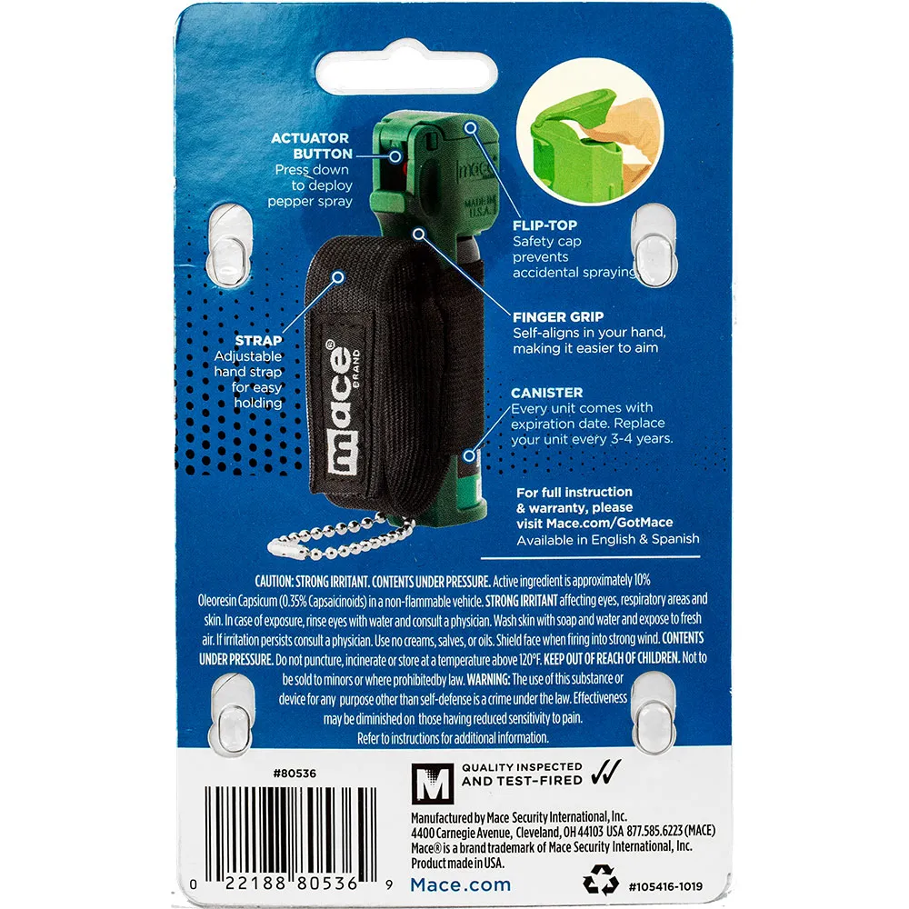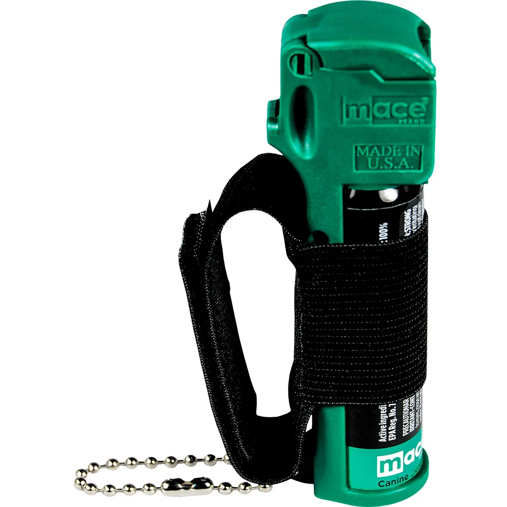 The Mace Canine Repellent is your powerful yet humane defense against threatening dogs and your ideal companion for outdoor activities. This OC pepper spray EPA-approved formula provides an intense burning sensation to any skin it touches, impaired vision and respiratory distress and coughing. This pepper spray made for dogs so it contains a lower concentration of OC compared sprays made for humans, as dogs' tear ducts work differently than those of humans and will prevent any unnecessary harm. It is not recommended to use on anything else other than dogs. With a flip-top safety cap and finger-grip dispenser you'll be safe while delivering this effective stream of heat with 20 bursts that reach up to 10 feet! The adjustable hand strap ensures a secure and comfortable fit and the built in keychain means you can keep this spray close when walking at night or out on your morning jog. Made in the USA Product Features: - Weight: 18 grams / 0.63oz - Flip-top safety cap for easy access. - Finger grip dispenser provides steady long streams of mace for added accuracy. - Velcro Wrist Strap for easy holding. - Adjustable hand strap provides secure, comfortable fit. - Built in Keychain enables easy carrying on person or bike/purse etc. - Made with OC formula here in the USA for maximum effectiveness. - EPA Registered - Provides 20 bursts up to 10 feet away from attacker/dog with an intense burning sensation to the skin causing respiratory issues and limited vision.