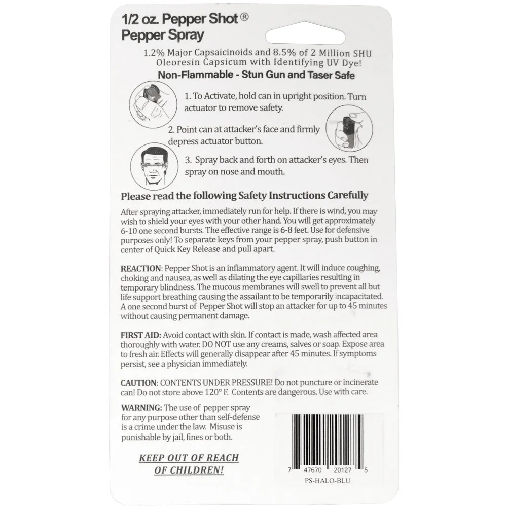 Pepper Shot 1.2% MC 1/2 oz Halo Holster and quick release keychain blue. Pepper Shot Pepper Spray is made with 1.2% Major Capsaicinoids. The Major Capsaicinoids are the true heat measure and Pepper Shot 1.2% MC is more effective than of most other pepper sprays. In addition to causing an attacker pain, The Pepper Shot 8.5% oleoresin capsicum formula swells the mucous membranes, which makes breathing difficult, and swells the veins in the eyes, causing the eyes to close. It's made from 2,000,000 SHU's of raw pepper and these effects can last up to 45 minutes and cause no permanent damage. Has a UV identifying dye to help aid in the identification of an attacker. This model has a locking actuator. 1/2 ounce with halo holster, locking actuator and quick key release keychain. Effective up to 6-8 feet. Contains 6-10 one second bursts. 4 ¼" x 1 ⅝"