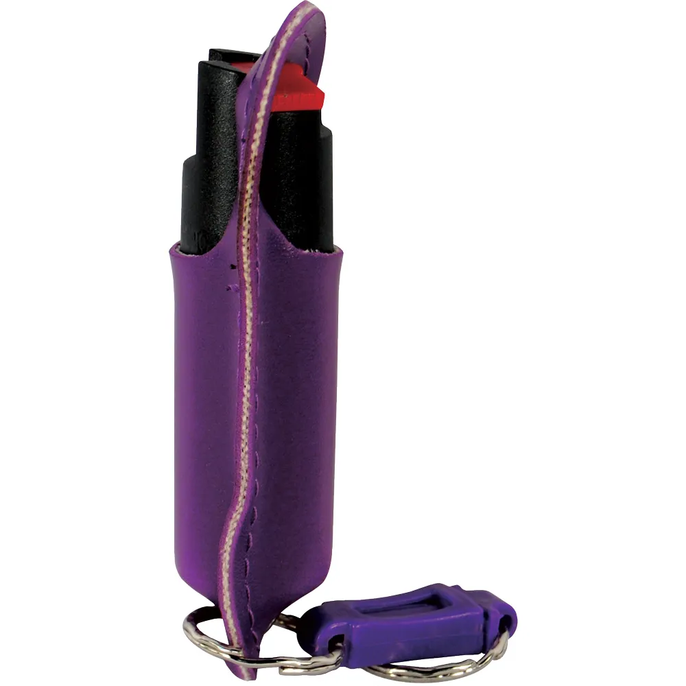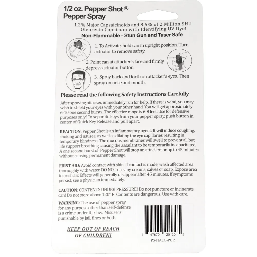 Pepper Shot 1.2% MC 1/2 oz Halo Holster and quick release keychain purple. Pepper Shot Pepper Spray is made with 1.2% Major Capsaicinoids. The Major Capsaicinoids are the true heat measure and Pepper Shot 1.2% MC is more effective than of most other pepper sprays. In addition to causing an attacker pain, The Pepper Shot 8.5% oleoresin capsicum formula swells the mucous membranes, which makes breathing difficult, and swells the veins in the eyes, causing the eyes to close. It's made from 2,000,000 SHU's of raw pepper and these effects can last up to 45 minutes and cause no permanent damage. Has a UV identifying dye to help aid in the identification of an attacker. This model has a locking actuator. 1/2 ounce with halo holster, locking actuator and quick key release keychain. Effective up to 6-8 feet. Contains 6-10 one second bursts. 4 ¼" x 1 ⅝"