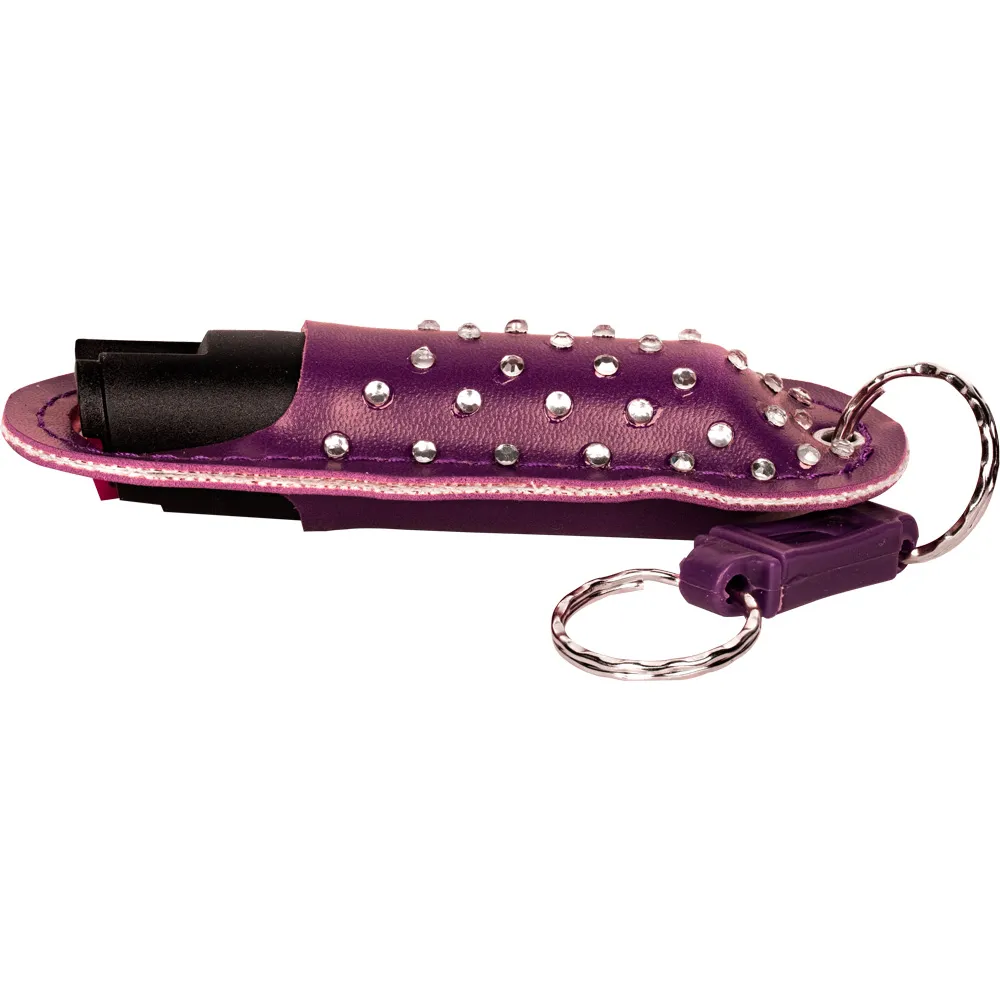 Pepper Shot 1.2% MC 1/2 oz Halo Rhinestone leatherette holster purple. Pepper Shot Pepper Spray is made with 1.2% Major Capsaicinoids. The Major Capsaicinoids are the true heat measure and Pepper Shot 1.2% MC is more effective than of most other pepper sprays. In addition to causing an attacker pain, The Pepper Shot 8.5% oleoresin capsicum formula swells the mucous membranes, which makes breathing difficult, and swells the veins in the eyes, causing the eyes to close. It's made from 2,000,000 SHU's of raw pepper and these effects can last up to 45 minutes and cause no permanent damage. Has a UV identifying dye to help aid in the identification of an attacker. 1/2 oz with halo rhinestone leatherette holster, locking actuator and quick key release keychain. Effective up to 6-8 feet. Contains 6-10 one second bursts. 4 ¼" x 1 ½"