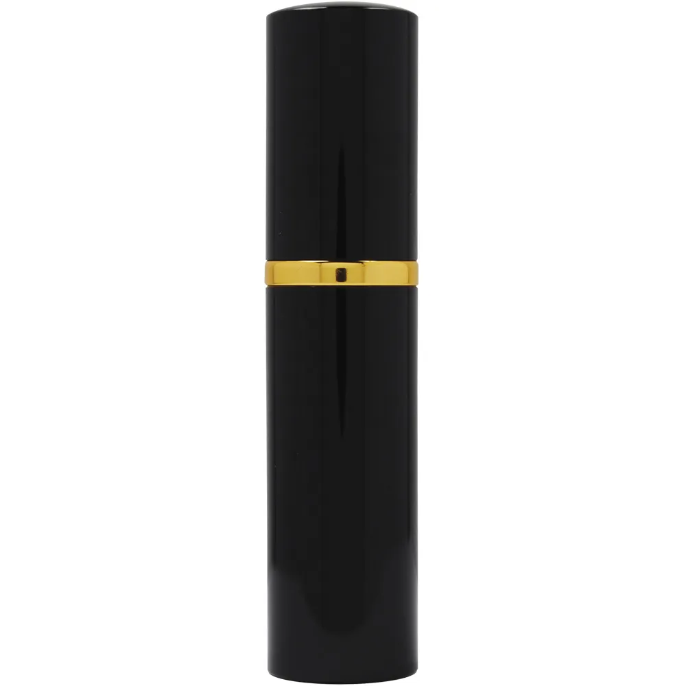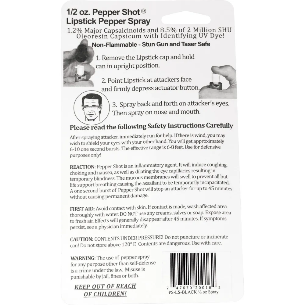 Pepper Shot 1.2% MC 1/2 oz lipstick pepper spray black. Its's designed for women. Pepper Shot Pepper Spray is made with 1.2% Major Capsaicinoids. The Major Capsaicinoids are the true heat measure and Pepper Shot 1.2% MC is more effective than of most other pepper sprays. In addition to causing an attacker pain, The Pepper Shot 8.5% oleoresin capsicum formula swells the mucous membranes, which makes breathing difficult, and swells the veins in the eyes, causing the eyes to close. It's made from 2,000,000 SHU's of raw pepper and these effects can last up to 45 minutes and cause no permanent damage. Has a UV identifying dye to help aid in the identification of an attacker. This lipstick model is designed for women. The attractive lipstick case is sure to deceive and ward off potential attackers. Pretend you need to freshen your lipstick and POW! This ½ oz canister contains 6-10 one-second sprays with a range of 6-8 feet and is available in 4 colors. - Black, Pink, Red, and Silver 4” x ⅞”