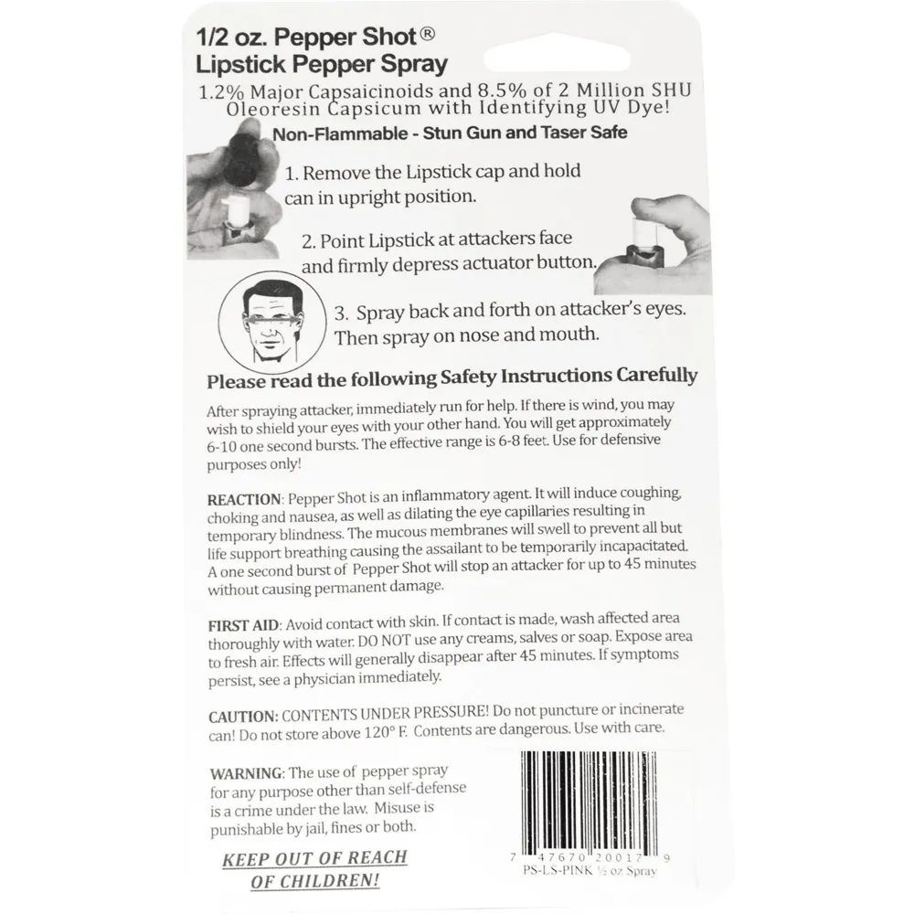 Pepper Shot 1.2% MC 1/2 oz lipstick pepper spray pink. Its's designed for women. Pepper Shot Pepper Spray is made with 1.2% Major Capsaicinoids. The Major Capsaicinoids are the true heat measure and Pepper Shot 1.2% MC is more effective than of most other pepper sprays. In addition to causing an attacker pain, The Pepper Shot 8.5% oleoresin capsicum formula swells the mucous membranes, which makes breathing difficult, and swells the veins in the eyes, causing the eyes to close. It's made from 2,000,000 SHU's of raw pepper and these effects can last up to 45 minutes and cause no permanent damage. Has a UV identifying dye to help aid in the identification of an attacker. This lipstick model is designed for women. The attractive lipstick case is sure to deceive and ward off potential attackers. Pretend you need to freshen your lipstick and POW! This ½ oz canister contains 6-10 one-second sprays with a range of 6-8 feet and is available in 4 colors. - Black, Pink, Red, and Silver 4” x ⅞”