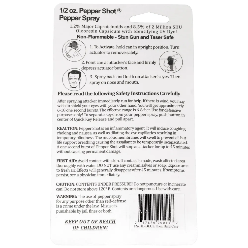 Pepper Shot 1.2% MC 1/2 oz pepper spray hard case belt clip and quick release keychain blue.