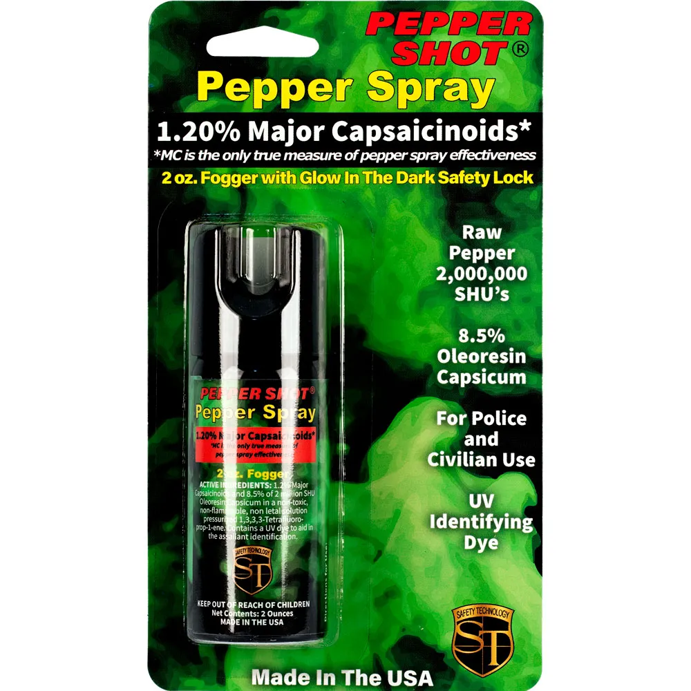 Pepper Shot 1.2% MC 2 oz pepper spray fogger. Pepper Shot Pepper Spray is made with 1.2% Major Capsaicinoids. The Major Capsaicinoids are the true heat measure and Pepper Shot 1.2% MC is more effective than of most other pepper sprays.