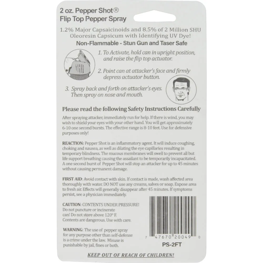 Pepper Shot 1.2% MC 2 oz pepper spray stream flip top stream. Pepper Shot Pepper Spray is made with 1.2% Major Capsaicinoids.