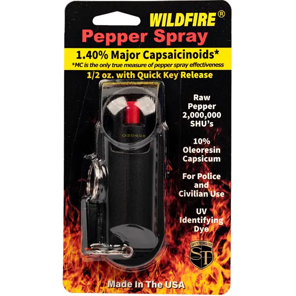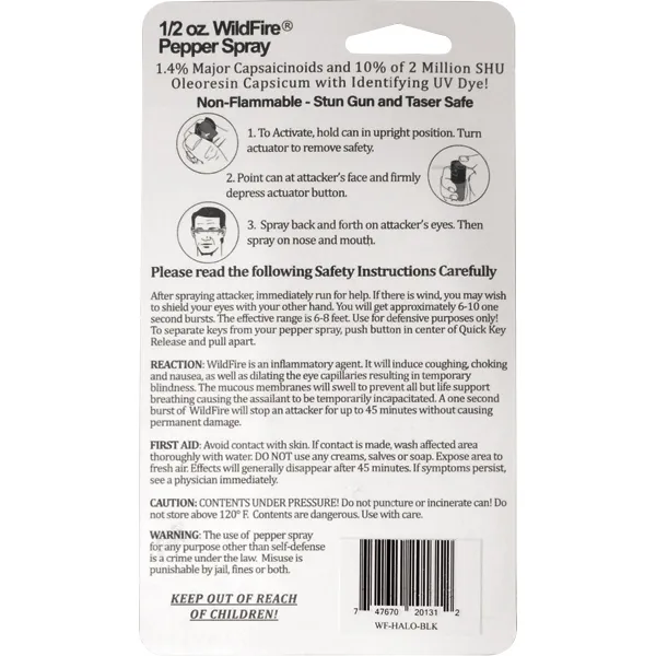 WildFire 1.4% MC 1/2 oz Halo Holster and quick release keychain black. The WILDFIRE® PEPPER SPRAY is hot, hot, hot. The Major Capsaicinoids are the true heat measure, WildFire has the hottest on the market at 1.4% Major Capsaicinoids. In addition to causing an attacker pain, The WildFire 10% oleoresin capsicum formula swells the mucous membranes, which makes breathing difficult, and swells the veins in the eyes, causing the eyes to close. It's made from 2,000,000 SHU's of raw pepper and these effects can last up to 45 minutes and cause no permanent damage. Has a UV identifying dye to help aid in the identification of an attacker. Wildfire 1/2 oz. Pepper Spray has a range of 6-8 feet and comes with a leatherette halo holster. Each unit provides 6-10 one-second bursts and comes with a quick key release keychain, and safety lock. 4 ¼" x 1 ⅝"