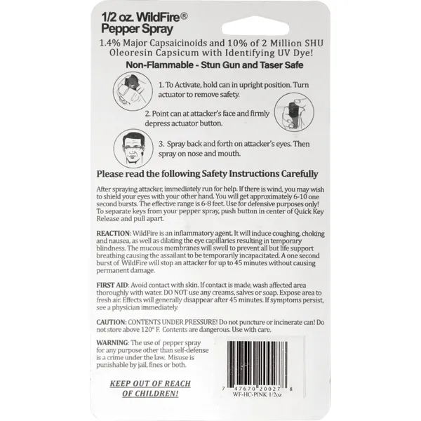 Wildfire 1/2 oz 1.4% MC pepper spray hard case and quick release keychain pink. The WILDFIRE® PEPPER SPRAY is hot, hot, hot. The Major Capsaicinoids are the true heat measure, WildFire has the hottest on the market at 1.4% Major Capsaicinoids. In addition to causing an attacker pain, The WildFire 10% oleoresin capsicum formula swells the mucous membranes, which makes breathing difficult, and swells the veins in the eyes, causing the eyes to close. It's made from 2,000,000 SHU's of raw pepper and these effects can last up to 45 minutes and cause no permanent damage. Has a UV identifying dye to help aid in the identification of an attacker. Wildfire 1/2 oz. Pepper Spray has a range of 6-8 feet and comes with a hard case. Each unit provides 6-10 one-second bursts and comes with a quick key release keychain, and safety lock. 3 ½" x 1 ½"