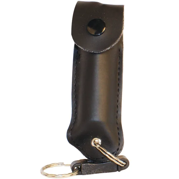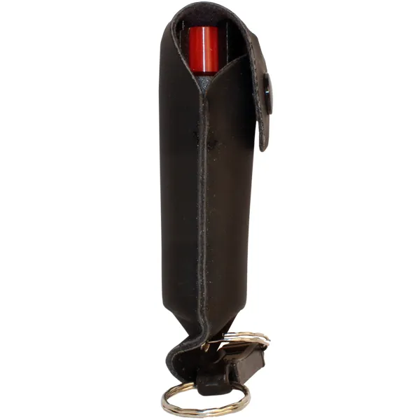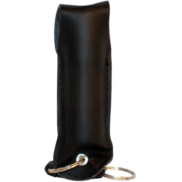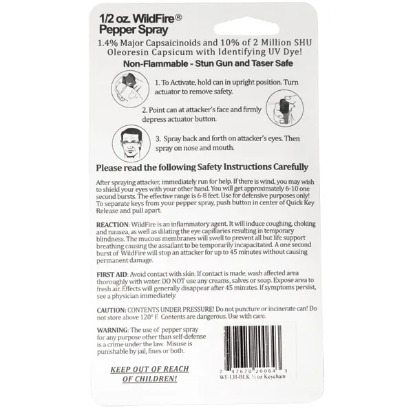 Wildfire 1/2 oz leatherette holster and Quick Release Key Chain black. The WILDFIRE® PEPPER SPRAY is hot, hot, hot. The Major Capsaicinoids are the true heat measure, WildFire has the hottest on the market at 1.4% Major Capsaicinoids. In addition to causing an attacker pain, The WildFire 10% oleoresin capsicum formula swells the mucous membranes, which makes breathing difficult, and swells the veins in the eyes, causing the eyes to close. It's made from 2,000,000 SHU's of raw pepper and these effects can last up to 45 minutes and cause no permanent damage. Has a UV identifying dye to help aid in the identification of an attacker. Wildfire 1/2 oz. Pepper Spray has a range of 6-8 feet and comes with a leatherette holster. Each unit provides 6-10 one-second bursts and comes with a quick key release keychain, and safety lock. 4 ¼" x 1 ½"