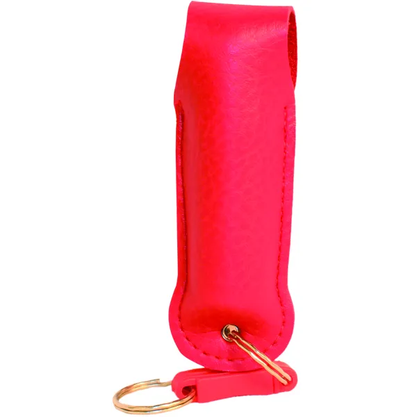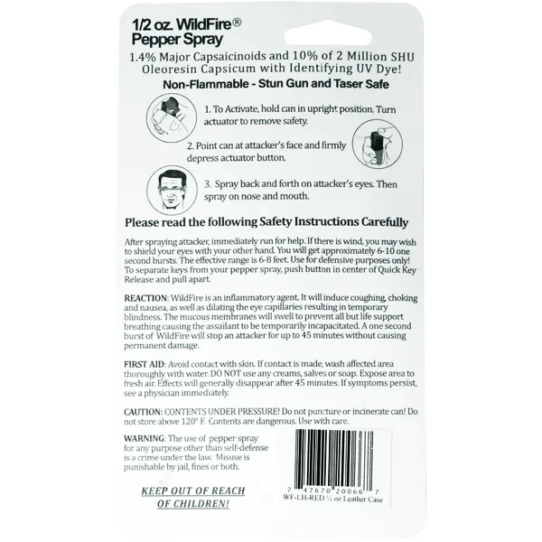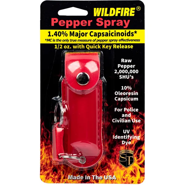 Wildfire 1/2 oz leatherette holster and Quick Release Key Chain red. The WILDFIRE® PEPPER SPRAY is hot, hot, hot. The Major Capsaicinoids are the true heat measure, WildFire has the hottest on the market at 1.4% Major Capsaicinoids. In addition to causing an attacker pain, The WildFire 10% oleoresin capsicum formula swells the mucous membranes, which makes breathing difficult, and swells the veins in the eyes, causing the eyes to close. It's made from 2,000,000 SHU's of raw pepper and these effects can last up to 45 minutes and cause no permanent damage. Has a UV identifying dye to help aid in the identification of an attacker. Wildfire 1/2 oz. Pepper Spray has a range of 6-8 feet and comes with a leatherette holster. Each unit provides 6-10 one-second bursts and comes with a quick key release keychain, and safety lock. 4 ¼" x 1 ½"