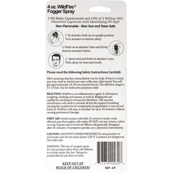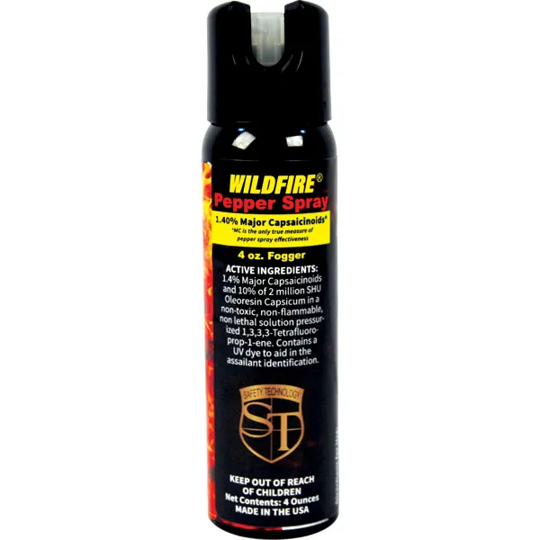 WildFire 4 oz 1.4% MC pepper spray fogger is a favorite with security guards and gives great protection at home. The WILDFIRE® PEPPER SPRAY is hot, hot, hot. The Major Capsaicinoids are the true heat measure, WildFire has the hottest on the market at 1.4% Major Capsaicinoids. In addition to causing an attacker pain, The WildFire 10% oleoresin capsicum formula swells the mucous membranes, which makes breathing difficult, and swells the veins in the eyes, causing the eyes to close. It's made from 2,000,000 SHU's of raw pepper and these effects can last up to 45 minutes and cause no permanent damage. Has a UV identifying dye to help aid in the identification of an attacker. Get the leatherette holster with belt clip to carry on your belt. Has a glow in the dark actuator. Approximately 18-20 one second bursts and a range 13-15 feet. 5 ⅞" x 1 ½"