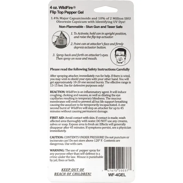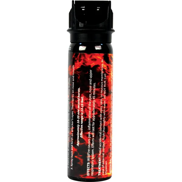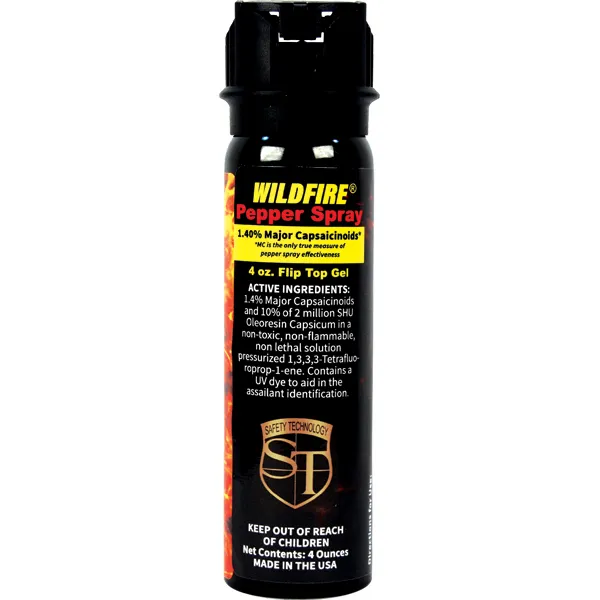 Wildfire 4 oz 1.4% MC flip top actuator pepper gel stream. The WILDFIRE® PEPPER SPRAY is hot, hot, hot. The Major Capsaicinoids are the true heat measure, WildFire has the hottest on the market at 1.4% Major Capsaicinoids. In addition to causing an attacker pain, The WildFire 10% oleoresin capsicum formula swells the mucous membranes, which makes breathing difficult, and swells the veins in the eyes, causing the eyes to close. It's made from 2,000,000 SHU's of raw pepper and these effects can last up to 45 minutes and cause no permanent damage. Has a UV identifying dye to help aid in the identification of an attacker. Once sprayed this Pepper Gel acts like glue to your assailant. If the attacker attempts to wipe or rub the Pepper Gel away it begins to permeate the skin leaving your attacker in pain. If used properly indoors you don’t have to worry about overspray, as it will stay in the direction where its sprayed and will not affect others in close proximity. Pepper Gel Sticky Pepper Spray is ideal for a car, recreational vehicle, camping, or home. This Pepper Gel Sticky Pepper Spray has many convenient features including: longer distance range, stronger pepper mixture, sticks to the target like glue, its also less contaminating, and nonflammable. Approximately 18-20 one second burst & range of 13-15 feet. 5 ⅞" x 1 ⅞"