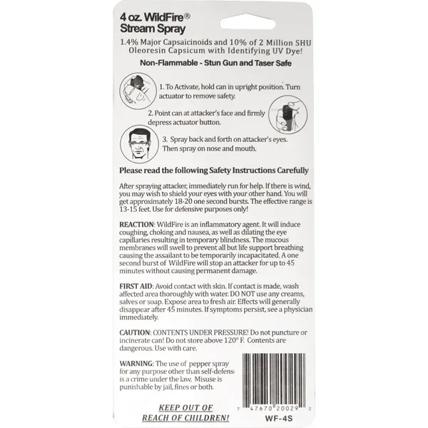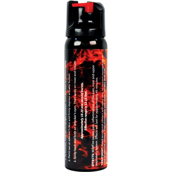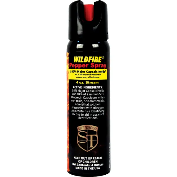 WildFire 4oz 1.4% MC pepper spray stream is a favorite with security guards and gives great protection at home. The WILDFIRE® PEPPER SPRAY is hot, hot, hot. The Major Capsaicinoids are the true heat measure, WildFire has the hottest on the market at 1.4% Major Capsaicinoids. In addition to causing an attacker pain, The WildFire 10% oleoresin capsicum formula swells the mucous membranes, which makes breathing difficult, and swells the veins in the eyes, causing the eyes to close. It's made from 2,000,000 SHU's of raw pepper and these effects can last up to 45 minutes and cause no permanent damage. Has a UV identifying dye to help aid in the identification of an attacker. Get the leatherette holster with belt clip to carry on your belt. Approximately 18-20 one second bursts and a range 13-15 feet. 5 ⅞" x 1 ½"