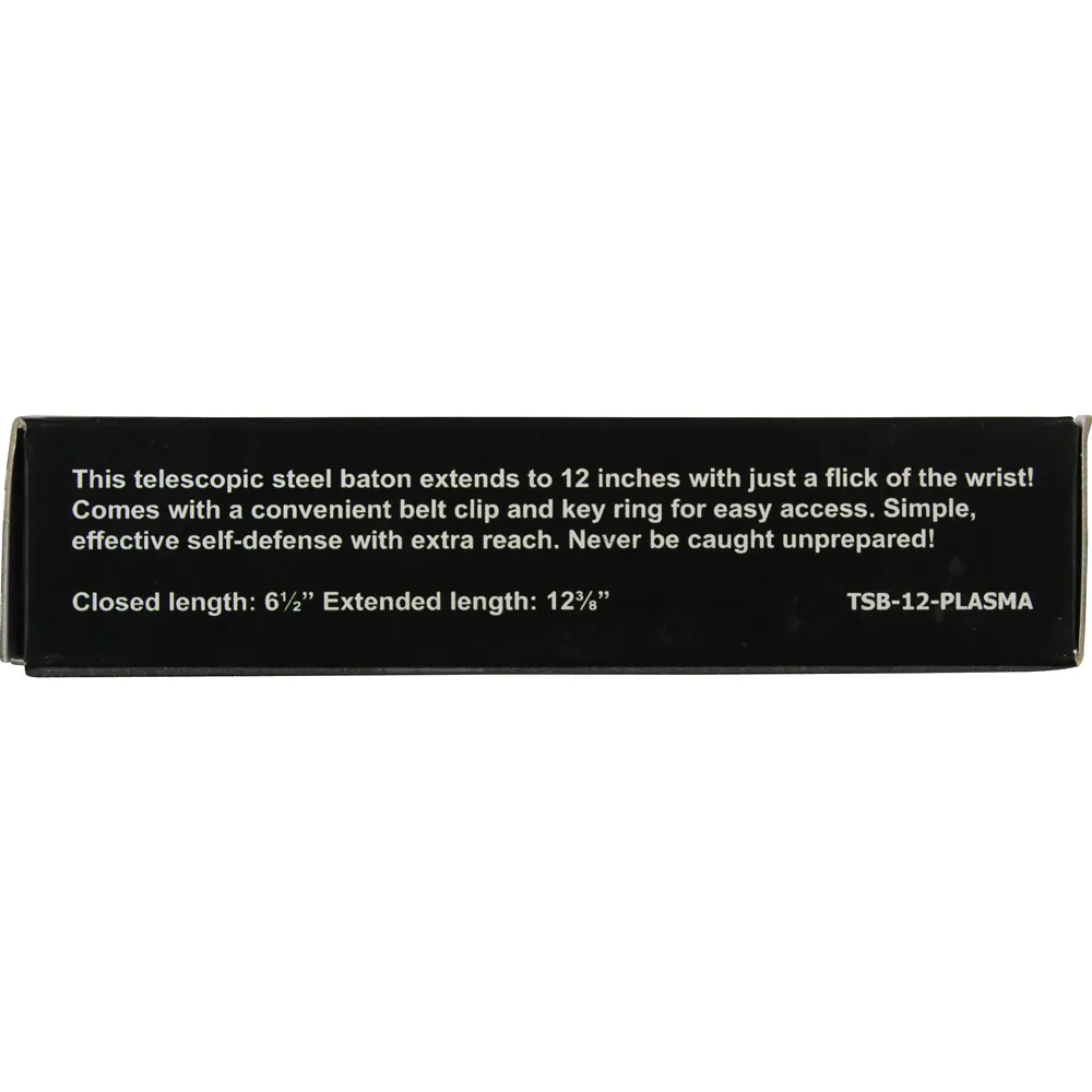 12 inch telescopic steel baton in your hand with a flick of the wrist! This expanding baton comes with a convenient belt clip and key ring for easy access. Simple, effective self-defense with extra reach. Never be caught unprepared! Closed length: 6.5” Expanded length: 12 3/8”