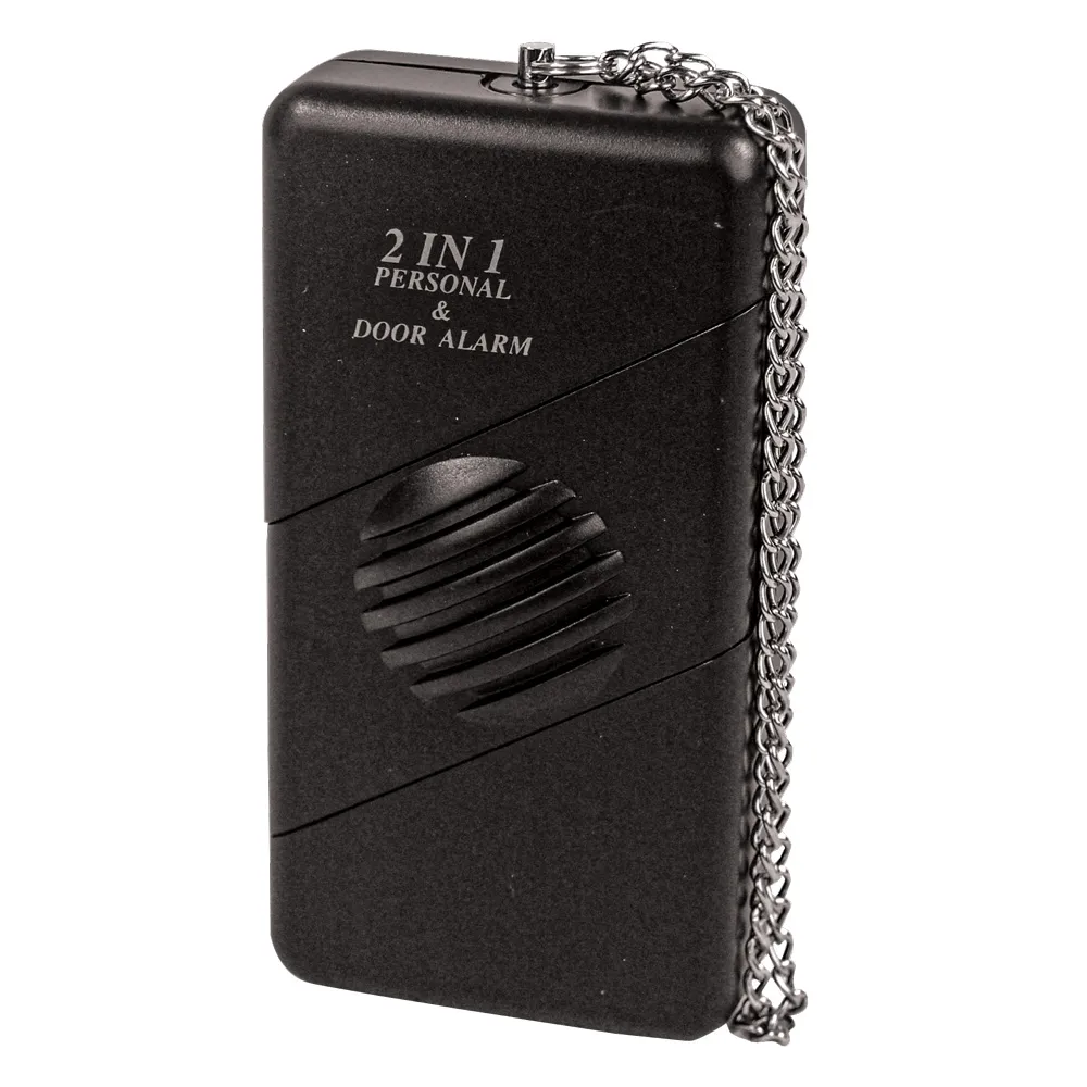 This is a 2N1 PERSONAL/DOOR ALARM. It acts as a burglar alarm and a personal alarm. Hang it on any door knob (non-metallic doors) and it instantly and automatically sounds when an intruder touches the door knob. Carry it with you and just pull out the metal chain to sound the alarm and deter an assailant. The alarm is 120 decibels. Requires one 9 volt battery. 4 ¼" x 2 ¼" x 1"