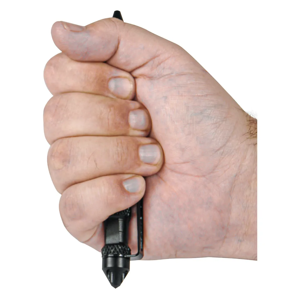 Tactical Black Twist Pen with Extra Refill. This pen has a black finished textured aluminum body for easy grip with glass breaker tip and a pocket clip for easy carry. I