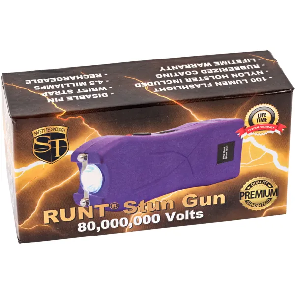 The rechargeable RUNT 80,000,000 volt stun guns now have an LED flashlight and wrist strap disable pin. It’s easily concealable, and virtually undetectable in the hand of a woman or a man.